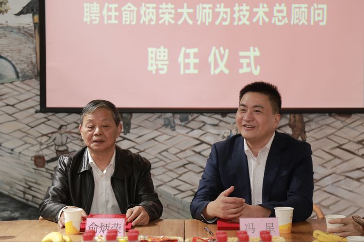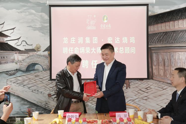 中式烹調(diào)師高級技師,嘉興市技師協(xié)會餐飲專業(yè)委員會主任,浙菜宗師俞炳榮大師受聘出任龍莊潤集團(tuán)旗下餐飲業(yè)態(tài)和宏達(dá)燒雞的首席技術(shù)總監(jiān)。龍莊潤集團(tuán)有限公司董事長馮星為俞炳榮老師頒發(fā)聘書。