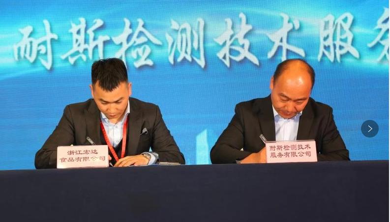 為保障食品安全,浙江江宏達(dá)食品有限公司和第三方安全檢測(cè)機(jī)構(gòu)耐斯檢測(cè)技術(shù)服務(wù)有限公司在會(huì)上簽署了合作協(xié)議。