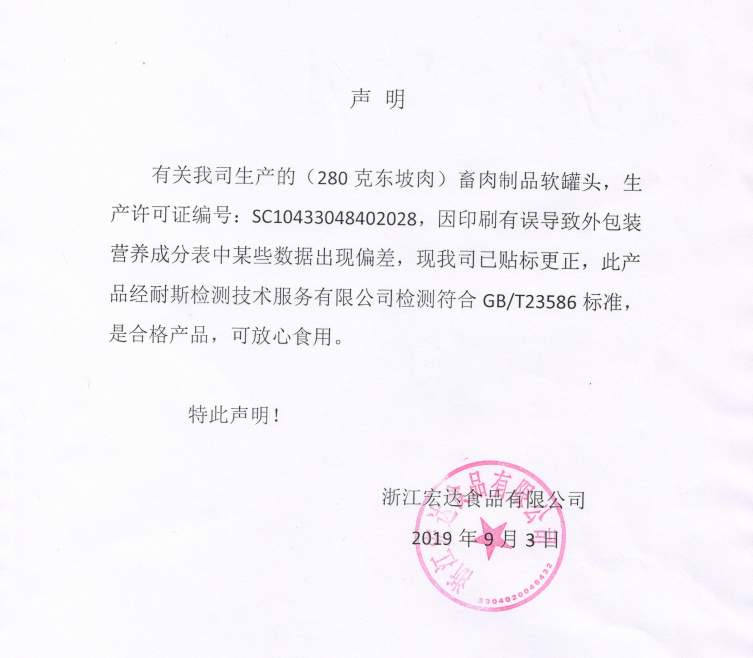 有關(guān)我司生產(chǎn)的(280克東坡肉)畜肉制品軟罐頭,生產(chǎn)許可證編號(hào):SC10433048402028,因印刷有誤導(dǎo)致外包裝營(yíng)養(yǎng)成分表中某些數(shù)據(jù)出現(xiàn)偏差,現(xiàn)我司已貼標(biāo)更正,此產(chǎn)品經(jīng)耐斯檢測(cè)技術(shù)服務(wù)有限公司檢測(cè)符合GB/T23586標(biāo)準(zhǔn),是合格產(chǎn)品,可放心食用。